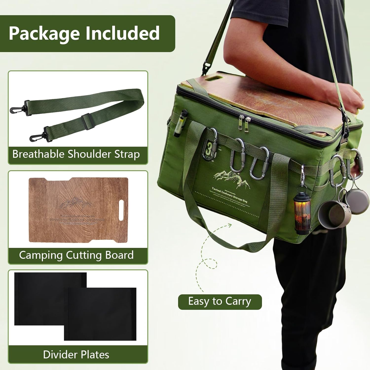 - Adjustable Dividers: The nylon storage bag features a foldable, high-capacity compartment. Two included Velcro dividers allow you to freely create three smaller compartments. The included cutting board simplifies camping tasks