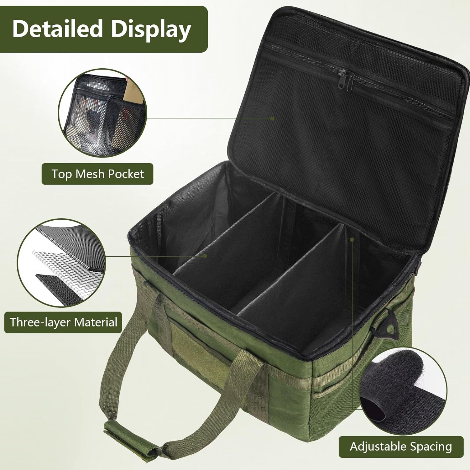- Kit Includes: One 36-liter large-capacity camping storage bag, one shoulder strap, one cutting board, and two dividers. The tactical camping storage bag measures 16 x 12 x 10 inches. Beyond camping use, it can be placed in the trunk as an organizational storage box