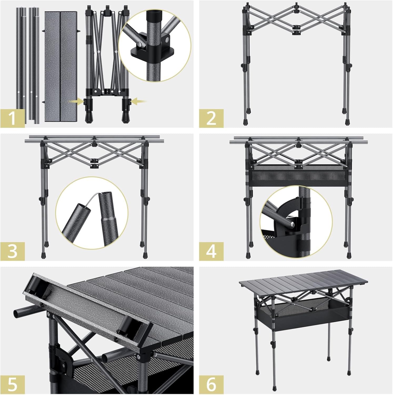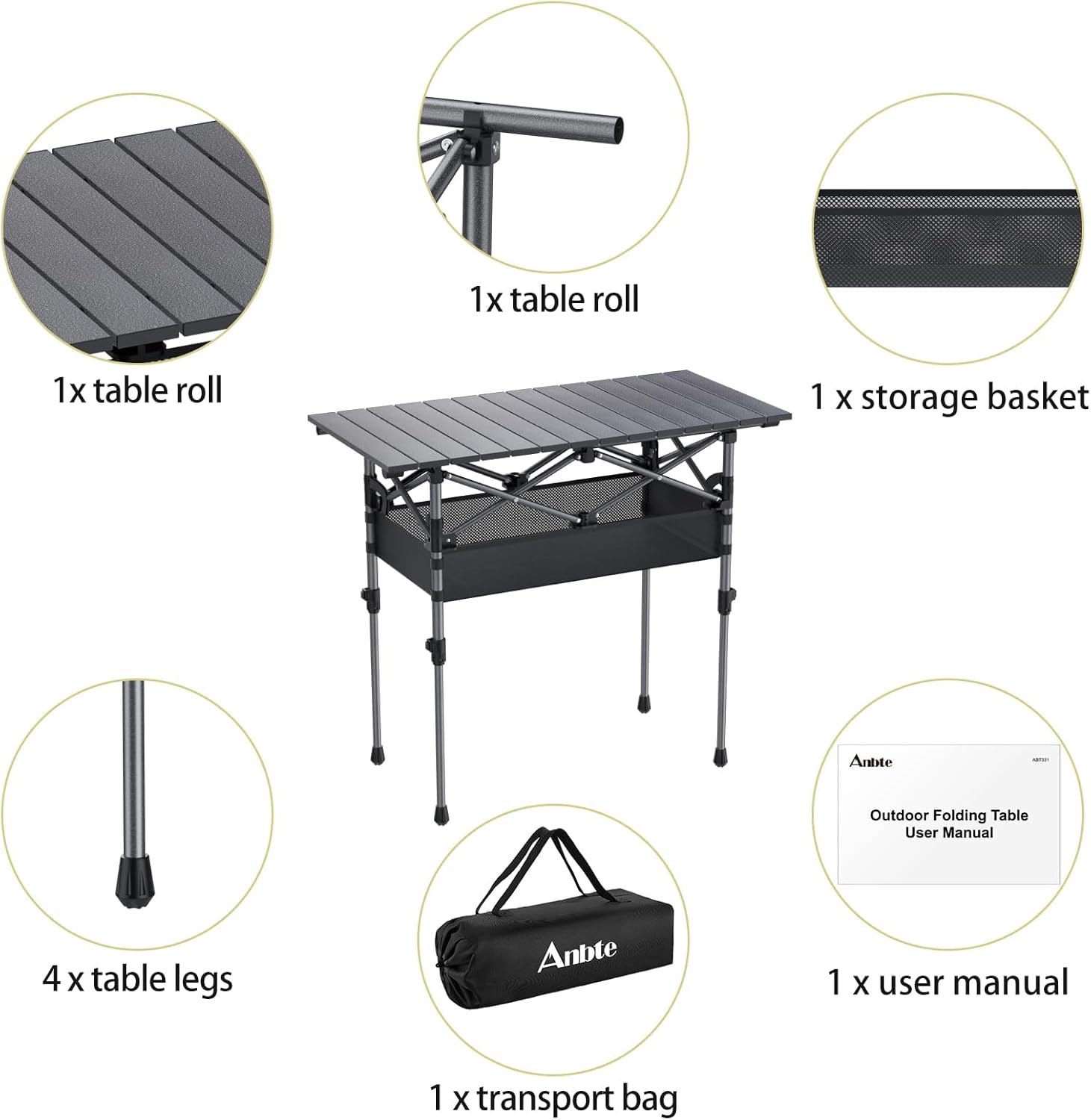 Anbte 3ft Aluminum Roll Top Camping Table, 2 Adjustable Height Camping Table Folding with Storage Net & Bag Lightweight Roll Up Table for Indoor Outdoor Backyard BBQ Patio Picnic, 32.2u201D X 16u201D, Black