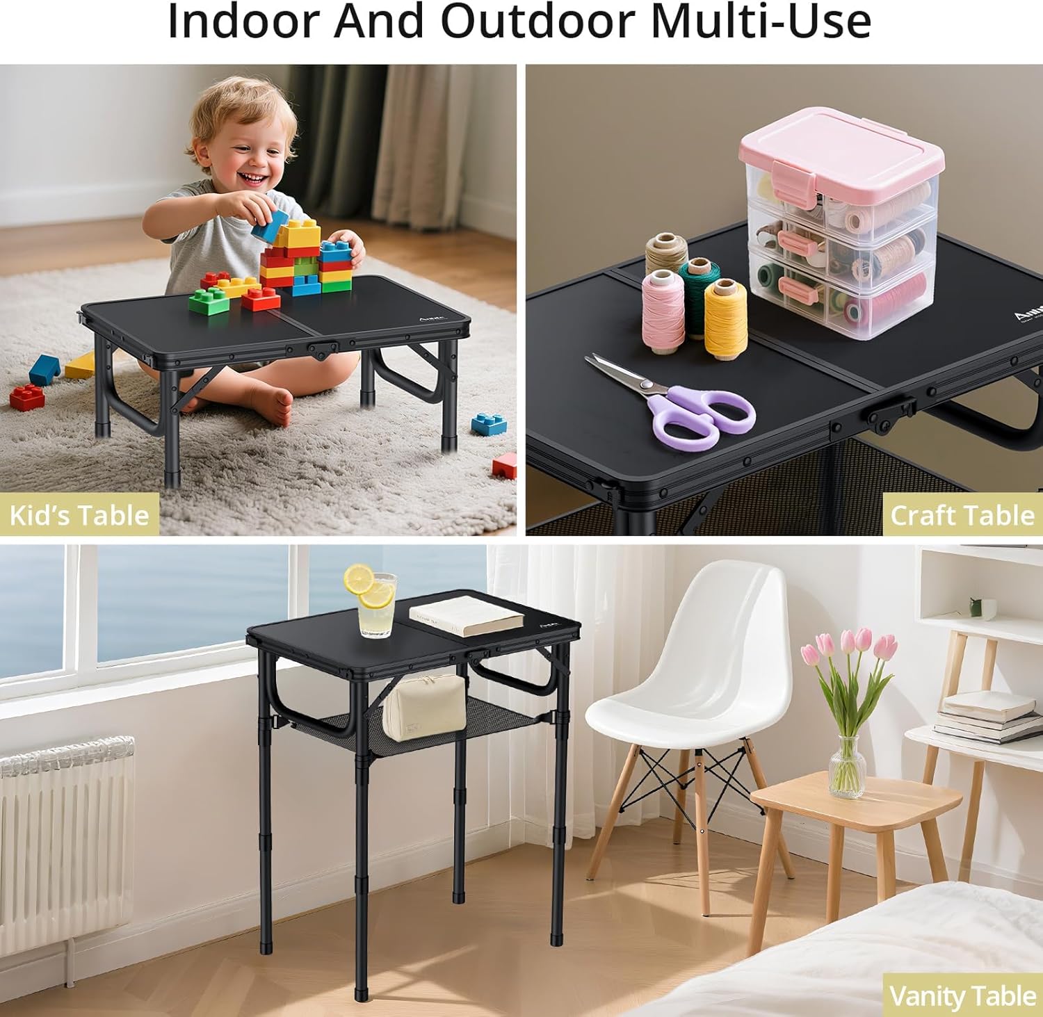 Anbte Folding Camping Table with Storage Net, Pure Black Aluminum 2ft Picnic Table 23.2″ x 16″ Outdoor Table Adjustable Height Max 27.5″, Lightweight, Waterproof, Portable Handle for Travel Cooking