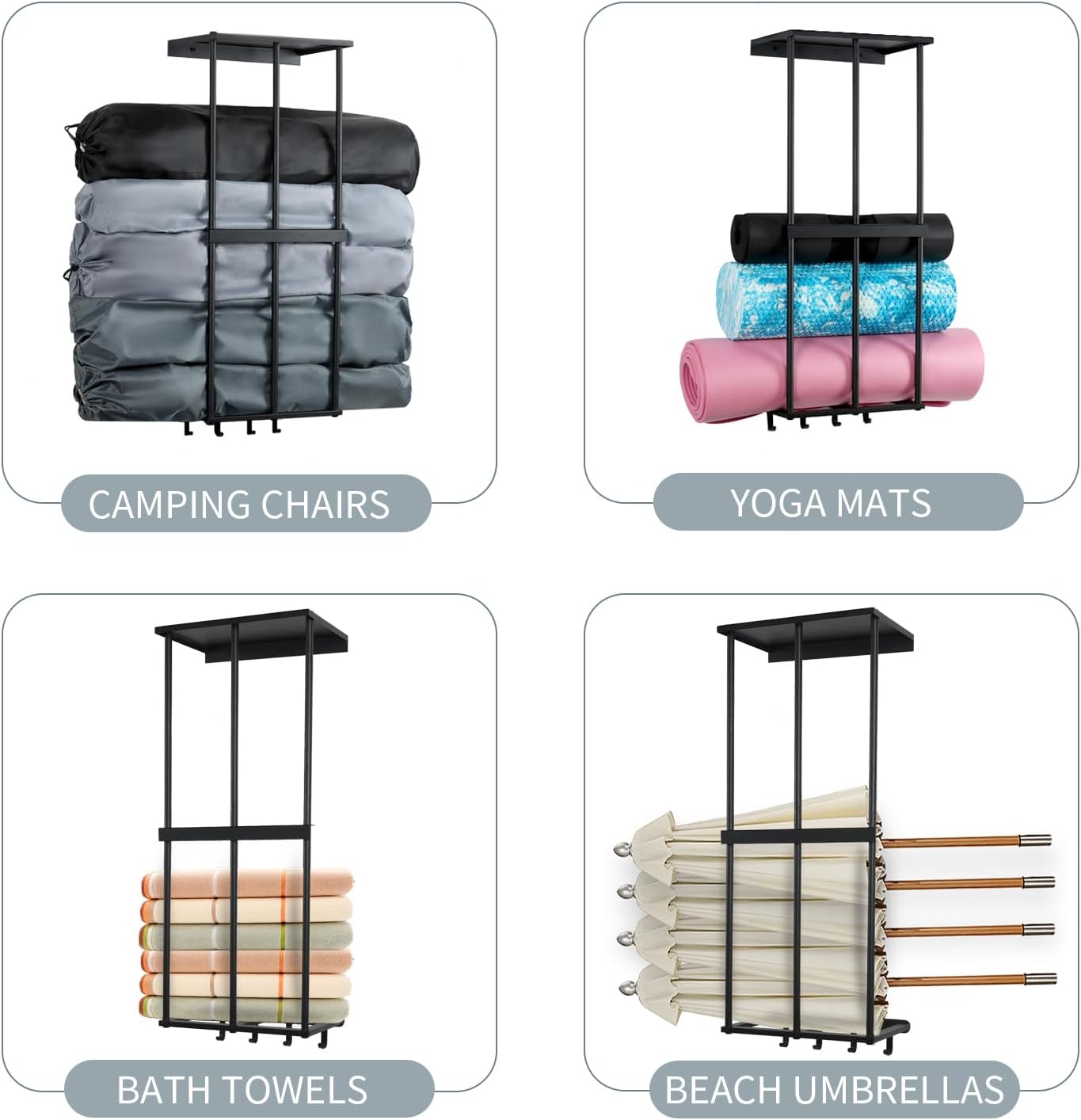 Camping Chair Rack for Garage Storage, Metal Camping Beach Chair Umbrella Holder Wall Mounted Rack Organizer Floating Shelf with 4 Hooks for Garage Organization
