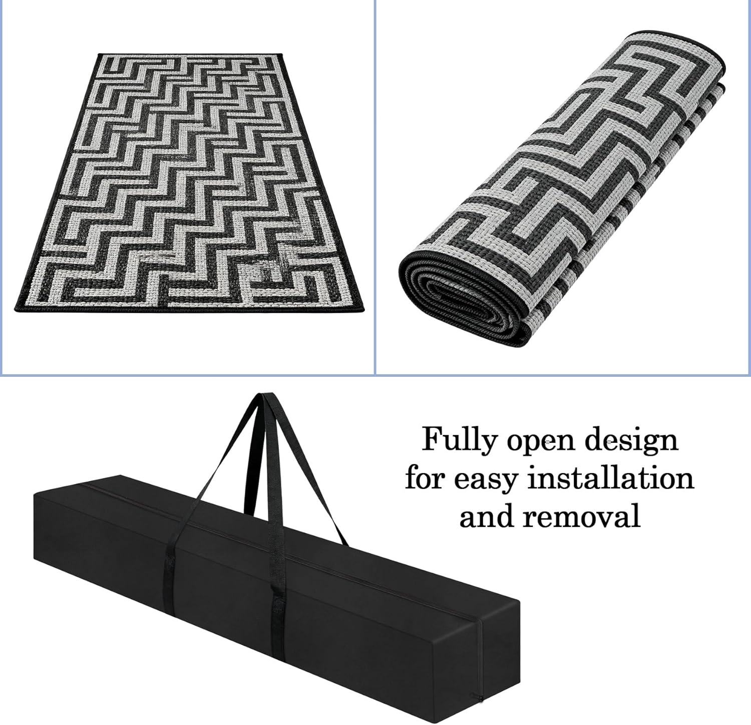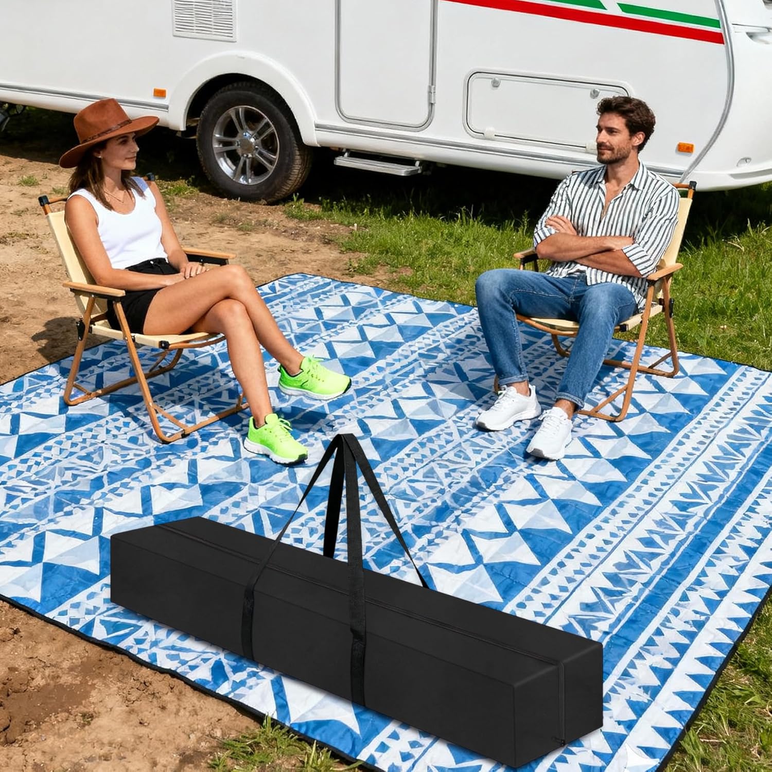 - Multi-functional: This large outdoor rug storage bag not only holds RV patio mats but also accommodates tent mats, beach blankets, picnic pads, and yoga mats. Perfect for family trips, couples' getaways, and parent-child outings, it effortlessly meets diverse outdoor storage needs