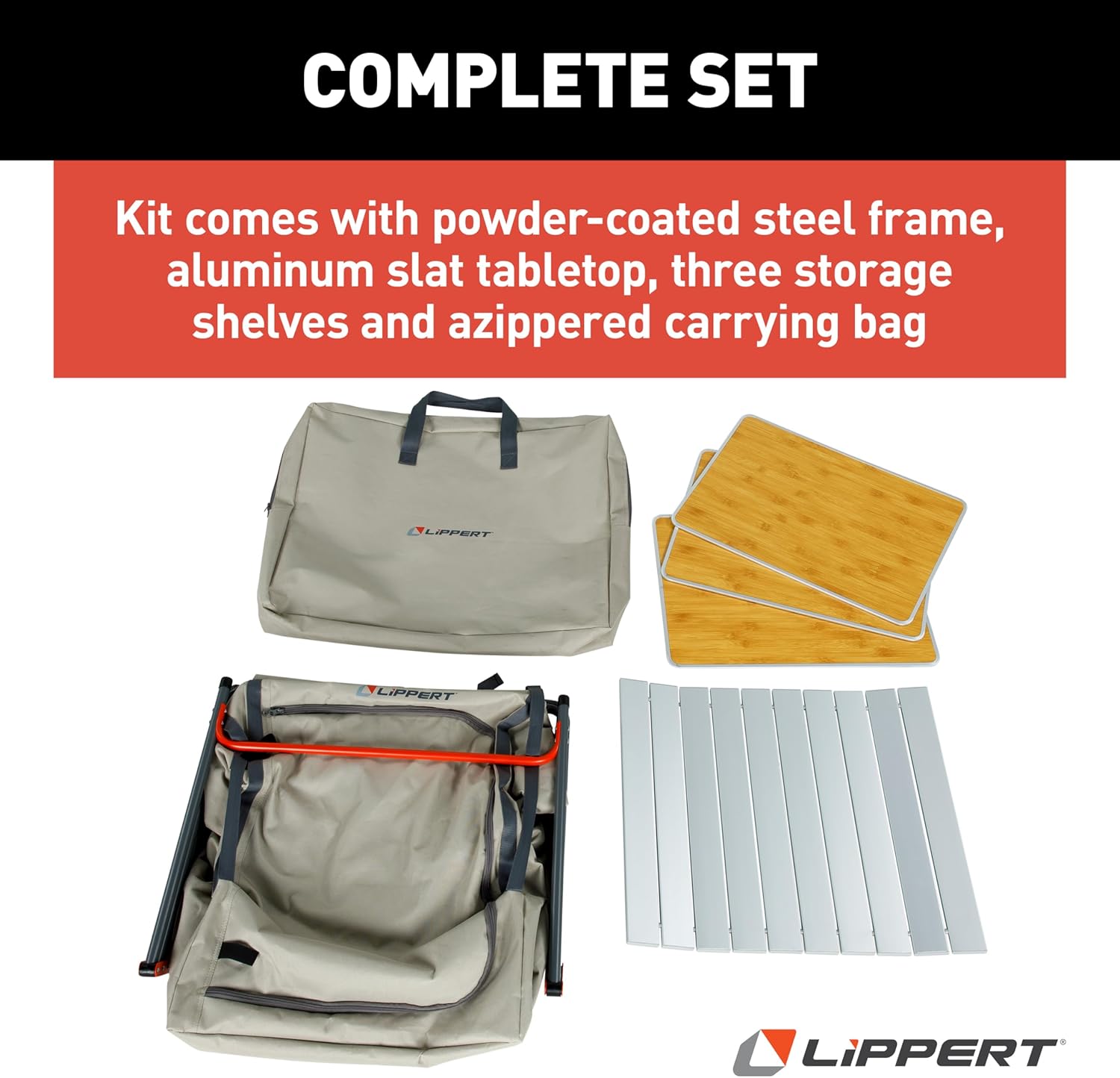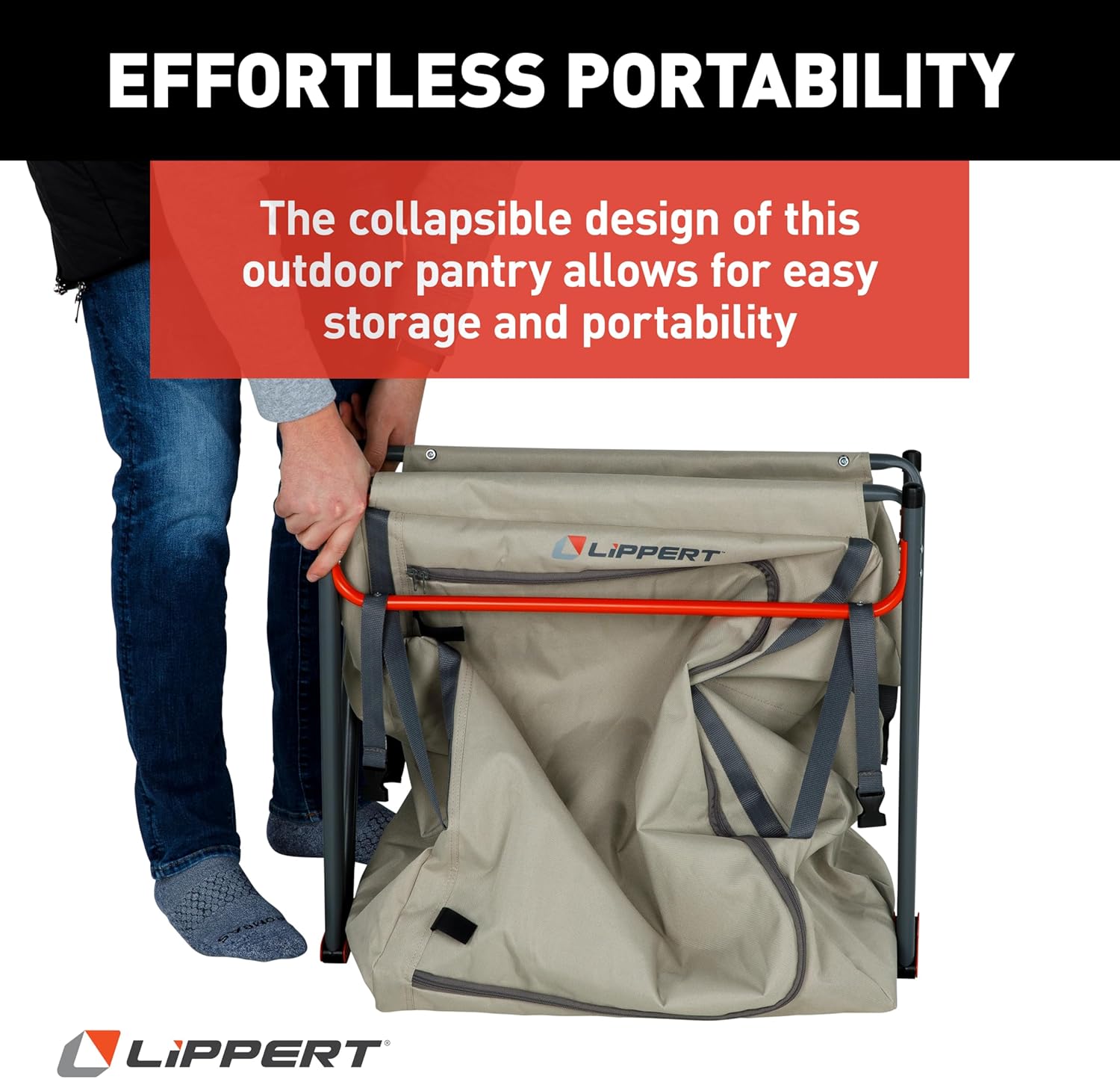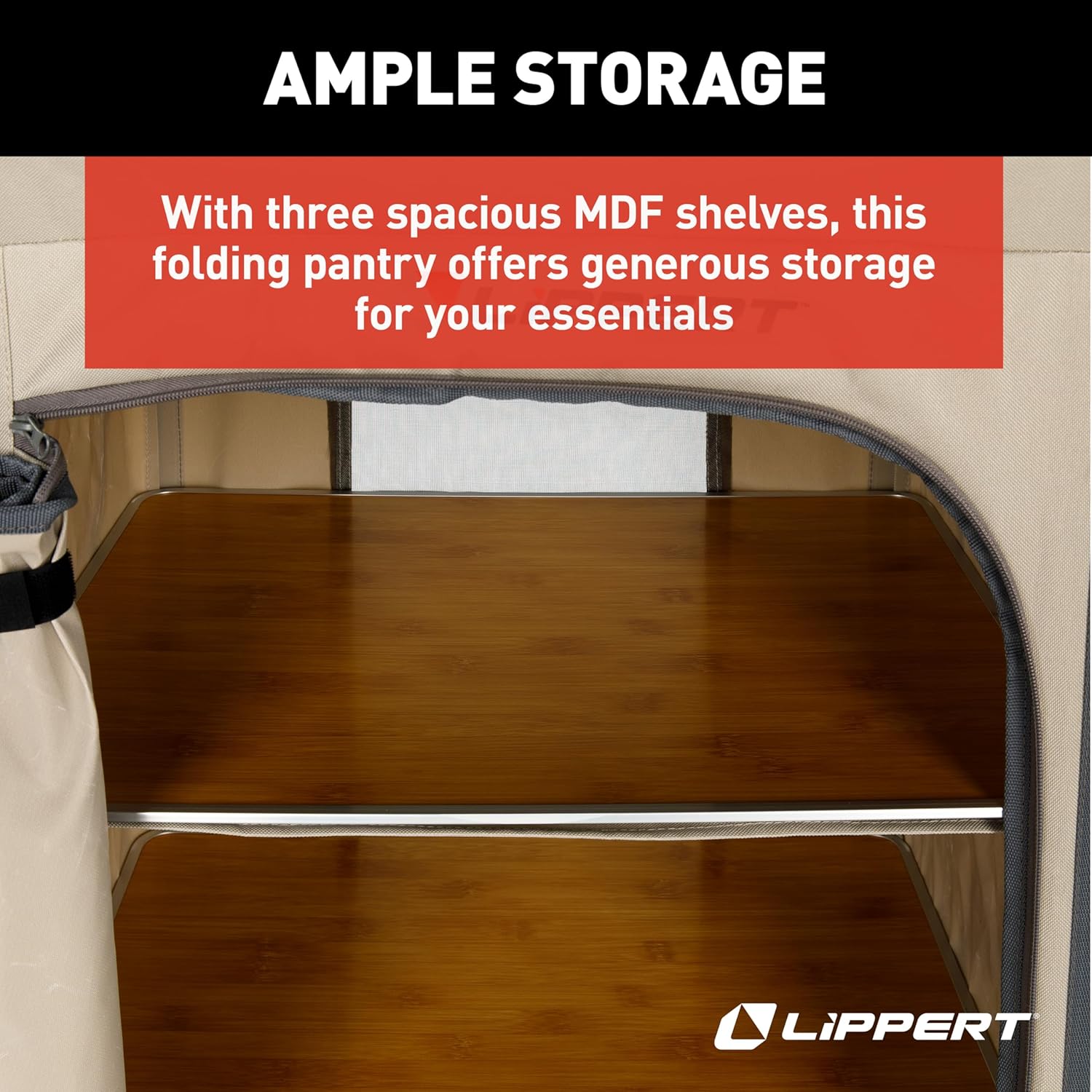 Lippert Sand Outdoor Folding Camping Pantry with Three Storage Shelves, 600D Polyester Fabric, Powder-Coated Steel Frame, Aluminum Slat Top, Collapsible Design – 2023053723