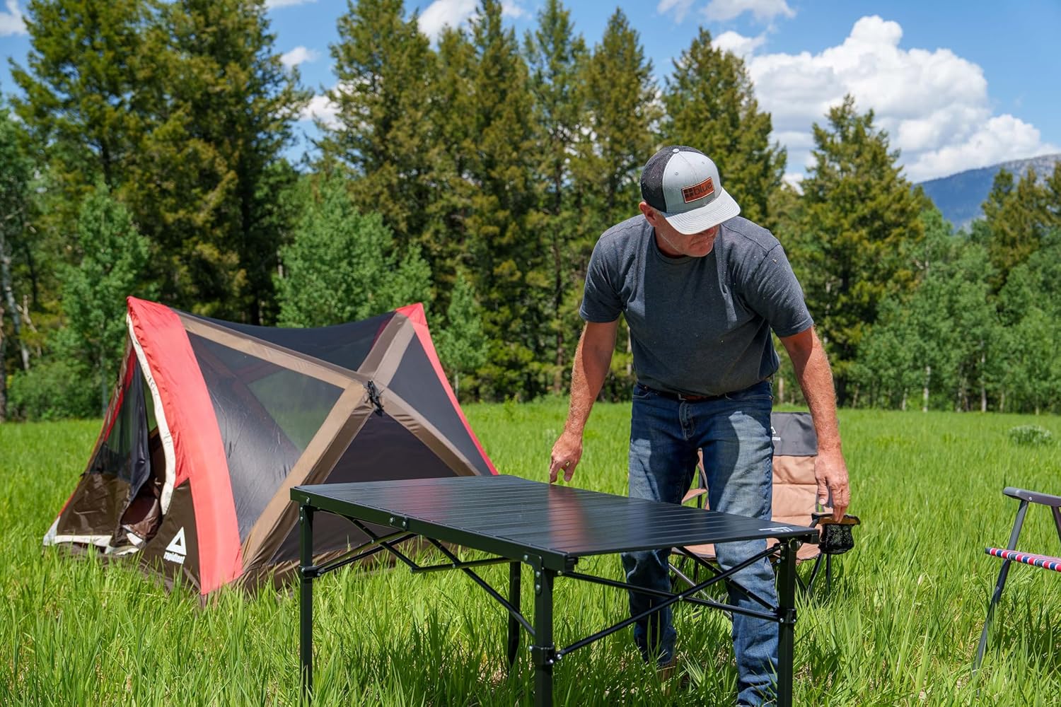 - Lightweight and Sturdy Design: The Mountain Summit Gear Roll-Top Table has a table top made from aluminum with a frame made of weather-resistant steel which makes this the perfect lightweight camping table with a weight capacity of 70 lbs.
