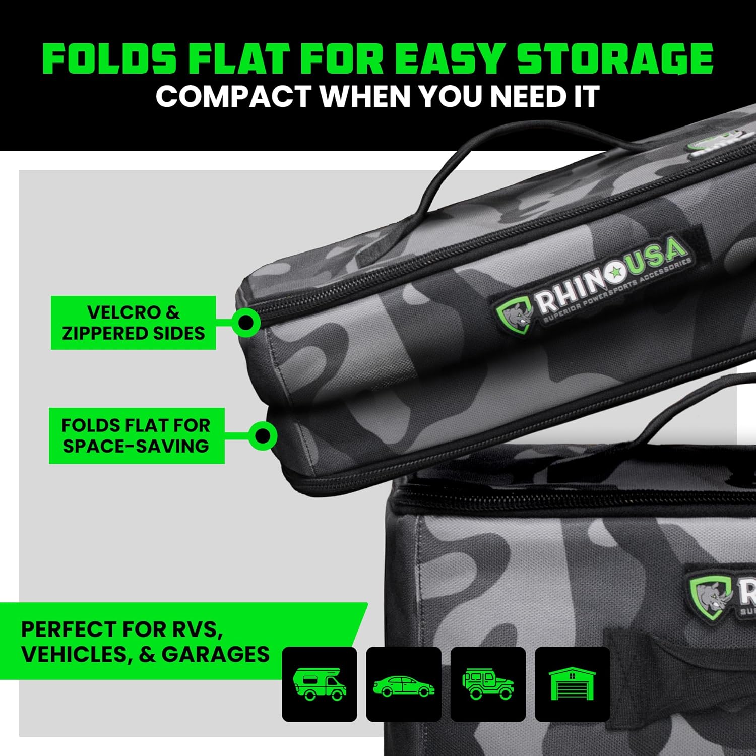 Maximize your storage space with a design that folds completely flat. Perfect for RVs, vehicles, and garages, these bags make it easy to store and pack gear, even in tight spaces.